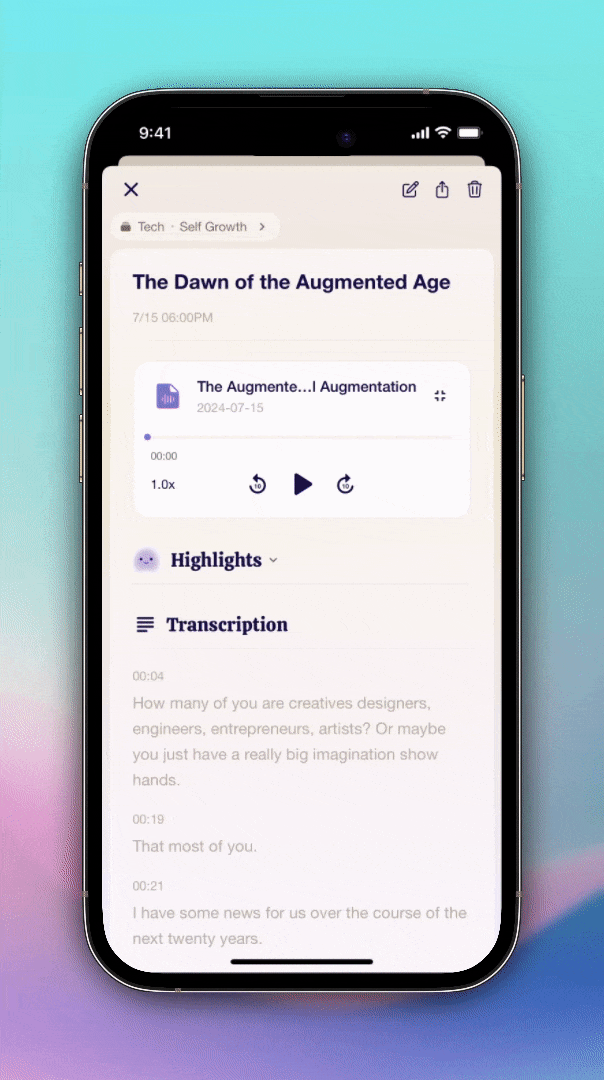 Me.bot creates highlights with precise timestamps for you, followed by detailed transcriptions.