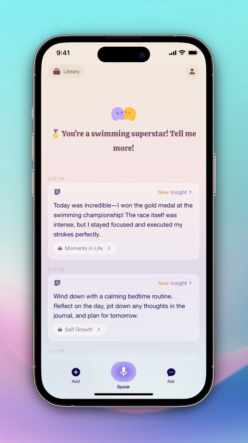 One way your memories are organized in Library is by Smart Topics like Self Growth, Tech, and more.